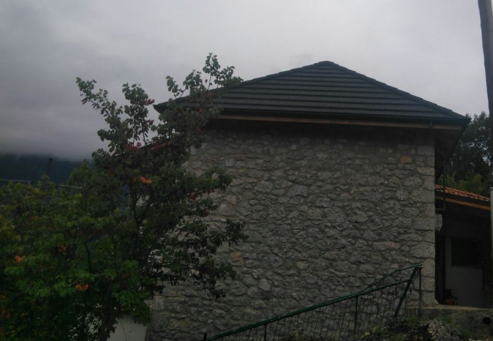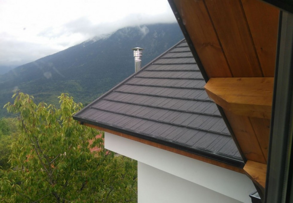 Μεταλλική στέγη Gerard® σε κατοικία με κυρίαρχα τα στοιχεία της πέτρας και του ξύλου. Σε ένα ειδυλλιακό τοπίο, η στέγη Gerard παρέχει απόλυτη αρμονία τονίζοντας τη φυσική ομορφιά του περιβάλλοντος.