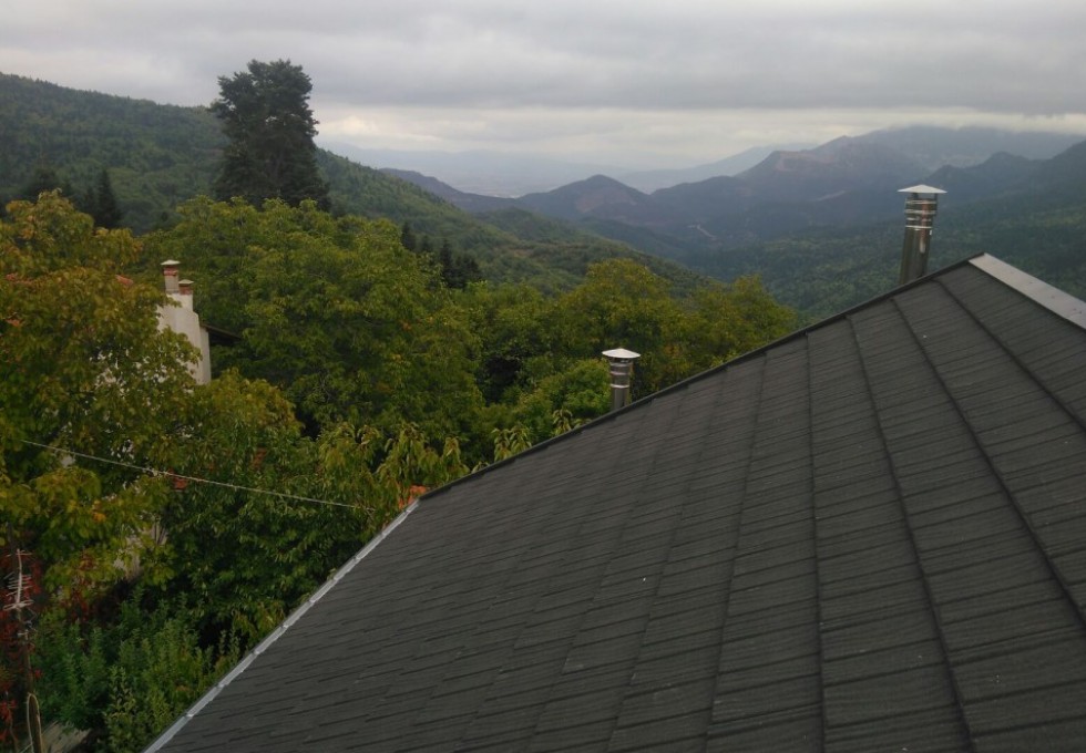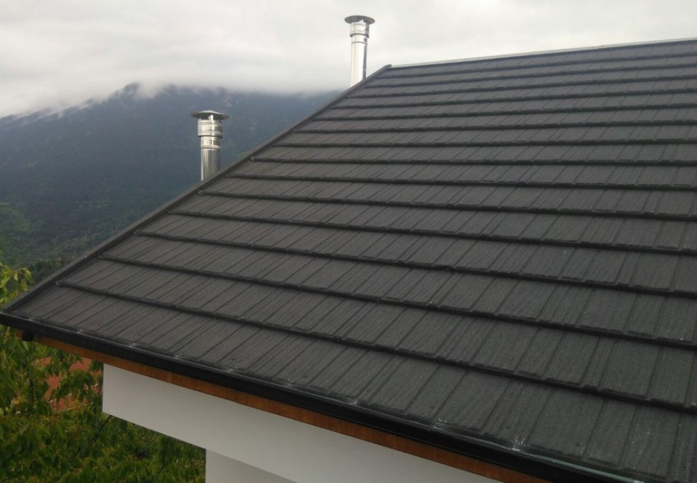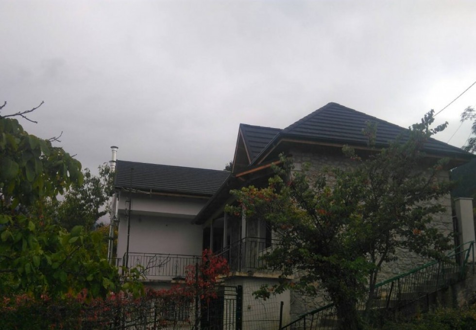 Μεταλλική στέγη Gerard® σε κατοικία με κυρίαρχα τα στοιχεία της πέτρας και του ξύλου. Σε ένα ειδυλλιακό τοπίο, η στέγη Gerard παρέχει απόλυτη αρμονία τονίζοντας τη φυσική ομορφιά του περιβάλλοντος.
