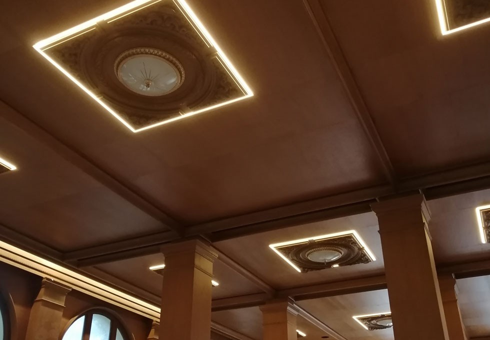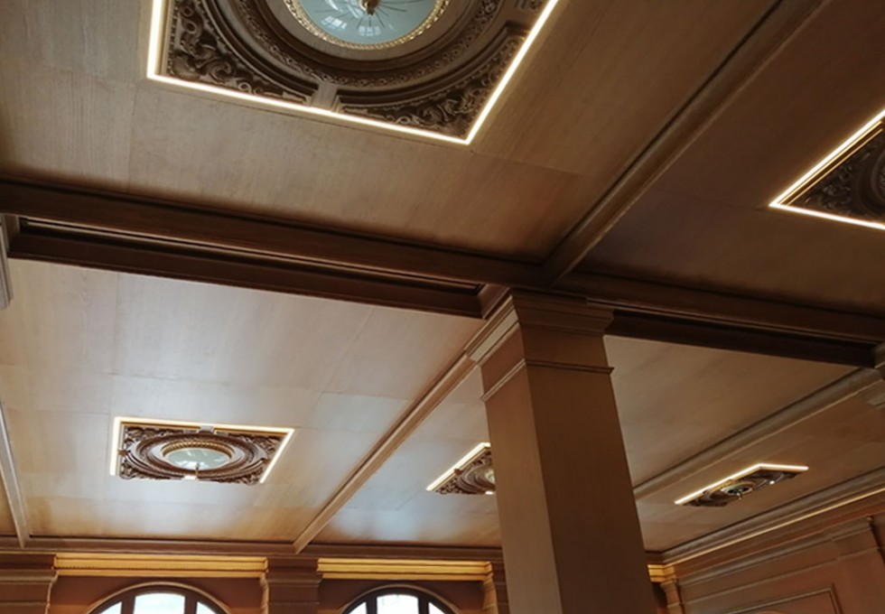 Ξύλινα ηχοαπορροφητικά διάτρητα πανέλα InterAcoustic με κυκλικές οπές τύπου Micro, εσωτερικού χώρου, εφαρμοσμένα σε οροφή με σκελετό ανάρτησης.